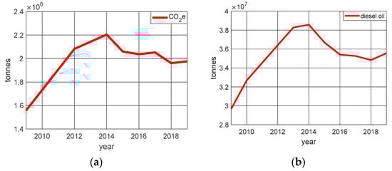 According to Benvenutti et al. [], within the energy sector’s greenhouse gas emissions, road transport is responsible for 91% of total CO2 emissions. In Figure 2, the variation in CO2 emission and the variation in the consumption of petroleum-derived diesel oil are presented, considering only vehicular activity.
