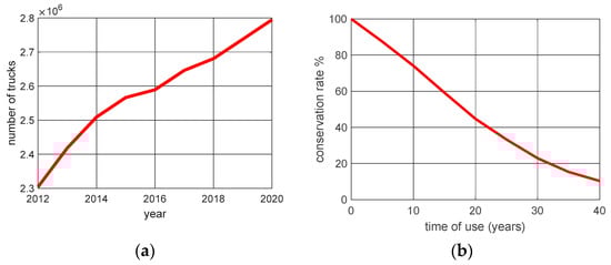 Figure 3 shows the number of truck-type vehicles in circulation in Brazil, as well as their rate of degradation according to the time of use.