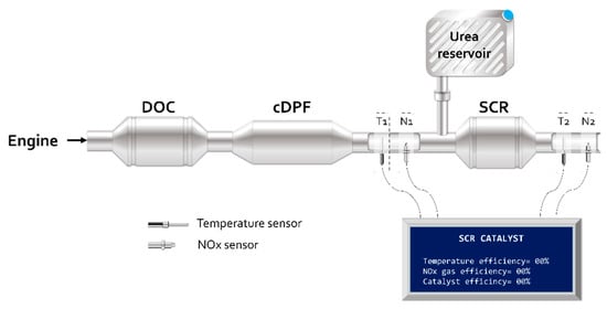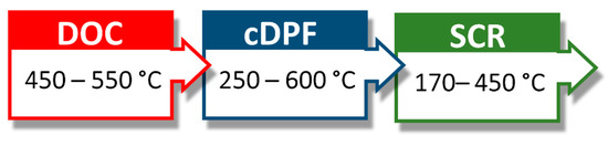 The conversion of NOx into N2 and H2O is highly dependent on the catalyst temperature; that is, it is susceptible to engine operating conditions []. For the temperature values to be corrected throughout the process, it is necessary to integrate sensing elements and electronic control devices. The most commonly used temperature sensors are the thermocouple and the RTD (Resistance Temperature Detector) sensors. Figure 4 shows the temperature variations in an exhaust gas treatment system of an internal combustion engine.