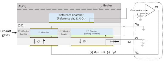 The sensor consists of two measuring Nernst cells. In addition to controlling the reactions within the chambers, the oxygen concentration in each cavity is also controlled by changing the pumping currents and comparing the reference cell potential with a setpoint value. To obtain the desired concentration, oxygen is pumped into or out of the cavities []. Figure 6 provides a schematic representation of the NOx electrical sensor.