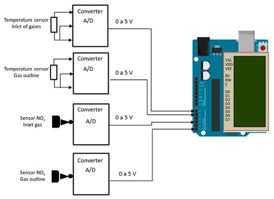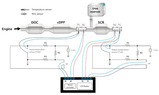 In Figure 7, the integration of NOx sensors, temperature, and the electronic device for conditioning and data acquisition in the post exhaust gas treatment system is presented. Figure 8 provides the electrical diagram of the temperature monitoring sensor and the NOx sensor, used to analyze the SCR catalyst performance.