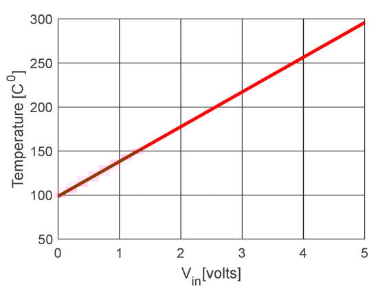 Figure 11 shows a graph of the temperature variation (T) of a PT 100 sensor, considering Equations (1), (3) and (4), for Vin = [0:5] Volts.