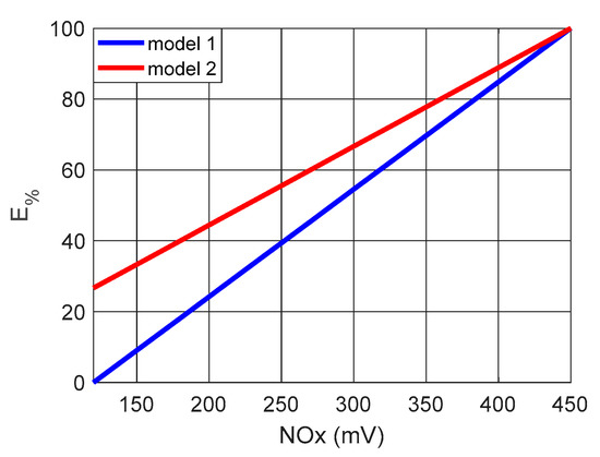 Another possibility for analyzing the efficiency of the reduction of NOx gases in an SCR catalyst is to evaluate the ddp signal provided by the sensor installed at the output of the SCR catalyst, using the desired value of 450 mV as a reference, using Equation (6).