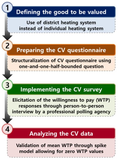 CV can be explained through the utility maximization of consumer behavior theory presented in microeconomics [,,]. Consumers can pay to consume DHS instead of IHS by as much as they can reduce spending on other goods and services to maximize their utility within a limited income. The AWTP of some consumers may be 0, while others may be positive. Consequently, in a CV survey, it is necessary to emphasize that interviewees’ income has a constraint. Moreover, it is also stressed that their stated AWTP means a reduction in spending on other goods or services. This point was sufficiently reflected in the survey conducted in this study. The procedure of applying the CV in this study is explained in detail in the following section and its flowchart is presented in Figure 1.