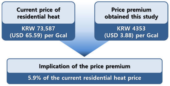 Kim et al.’s study [] resembles this study. The price premium of DHS found in the former was 6.0%, based on the price of KRW 95,510 per Gcal of IHS as of 2013. The price of IHS used in this study was KRW 73,587 per Gcal as of 2020, down about 23% from 2013. The price premium estimate from this study is 5.9%, which is almost the same as 6.0% of the previous study. In other words, although seven years have passed, the level of price premium remains unchanged and stable. Therefore, it does not seem unreasonable to use the results of this study in making decisions for the future.