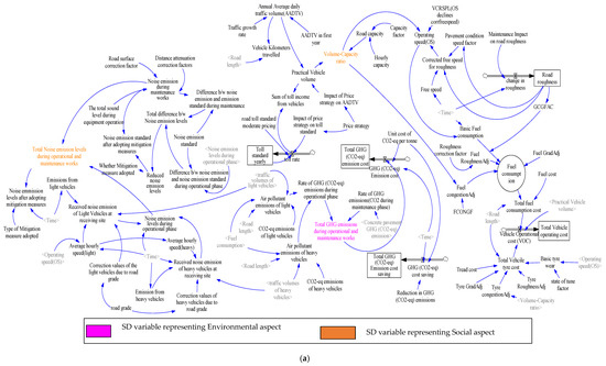 (a) Stock and flow model of the road infrastructure system depicting environmental and social aspects; (b) Stock and flow model of the road infrastructure system depicting economic, governance and social aspects.