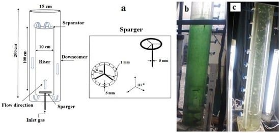 The airlift photobioreactor used in this experiment, as shown in Figure 1, was made of two vertical Plexiglas loops with a stainless-steel circular distributor installed at the bottom of the reactor. The distributor consisted of eighteen 1-mm holes placed at regular intervals.