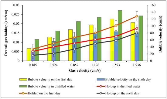 In Figure 3, the results of total gas holdup in cyanobacterial solution were compared with that obtained using distilled water (Figure 2). The mean bubble velocities in distilled water and cyanobacterial medium on the first and sixth days of cultivation were 109.97, 87.98, and 65.89 cm/s, respectively. Results indicated that the bubble velocity in both distilled water and cyanobacterial culture increased with increasing gas velocity, and bubbles were widely distributed. However, as the size of the bubbles directly influences the bubble velocity, higher bubble velocity was observed in distilled water compared to cyanobacterial culture due to a lower viscosity. This observation is in agreement with previous studies [,].