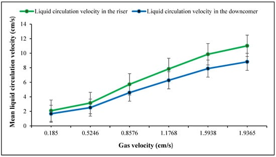 The movement of gas bubbles pushes the liquid upwards in the riser and falls in the downcomer. As shown in Figure 4, the increase in the gas velocity resulted in an increase in the liquid velocity of the riser and downcomer, but these changes were faster at low gas velocities. This observation is in close agreement with other studies [,].