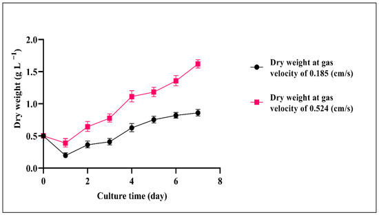 Dry weight of Spirulina sp. at two gas velocities (0.185, 0.524 cm/s), temperature 30 ± 1 °C and pH = 9.5 ± 0.02.