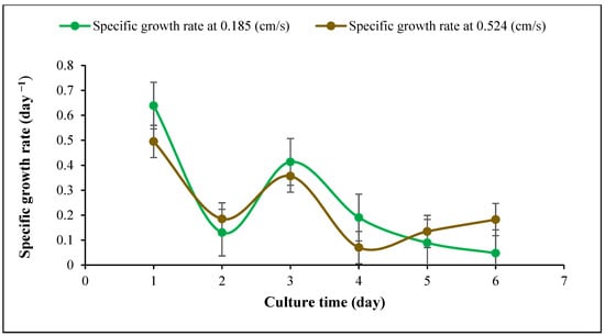 Specific growth rate of Spirulina sp. at two gas velocities (0.185, 0.524 cm/s), temperature 30 ± 1 °C and pH = 9.5 ± 0.02.