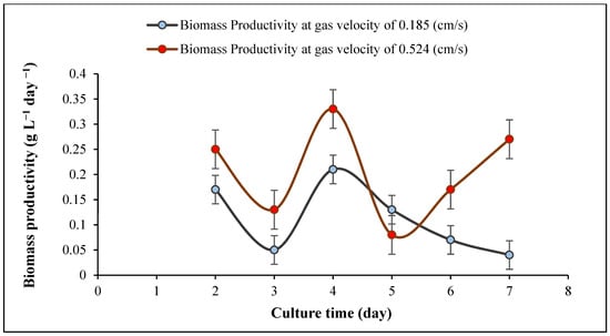Biomass productivity of Spirulina sp. at two gas velocities (0.185, 0.524 cm/s), temperature 30 ± 1 °C and pH = 9.5 ± 0.02.