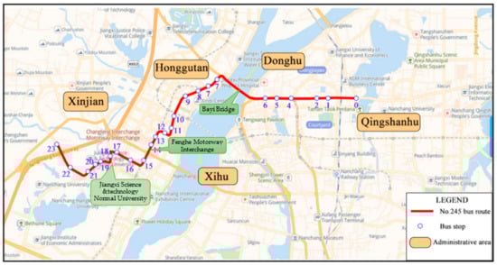 By consulting the information released by the Nanchang Public Transportation Company, it can be seen that the selected No. 245 bus route starts at the Wenjiao intersection on East Yangming Road in Nanchang and ends at Honggu New Town. The total length of the route is approximately 15 km, passing through 24 bus stops, with a general trend of east-west direction. The bus route and stop numbers are shown in Figure 3. The experimental line is a suburban line (a public transportation line located in the urban area and the suburbs close to the city) and operates in three administrative districts, namely Xinjian, Honggutan, and Donghu, Nanchang City, Jiangxi Province, China. It passes through Jiangxi Science & Technology Normal University (Hongjiaozhou Campus), Jiangxi Library, Nanchang No. 3 Middle School, and other places with large traffic flow, and connects with Metro Line 1 and Metro Line 2. The operation time of the experimental line is from 06:30 to 22:00 at the first and last shifts at the Wenjiao intersection of East Yangming Road. The No. 245 bus implements a one-ticket system. The peak hour flow of passengers on this line is about 2000 pax/h. The distances and drop-off rates between bus stops are shown in Table 2.