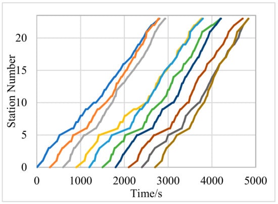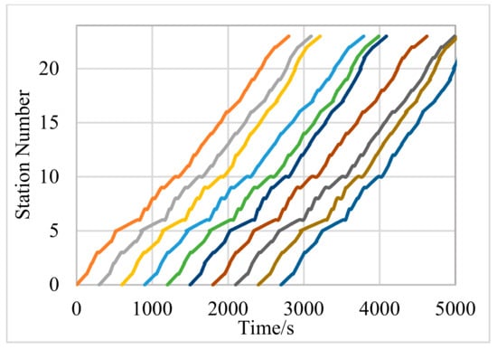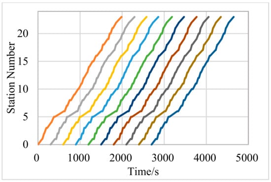 If there is no other vehicle interference on the route except the No. 245 bus, and the traffic lights at the crossings are always green, then . Through Python modeling and simulation, when the line is not controlled, the space-time diagram of bus operation is shown in Figure 4.