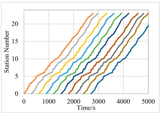 Based on the multi-point control of time headway, five control points were set for the whole route, and the compensation term based on time headway was added. The simulation obtained the running space-time diagram of the buses, as shown in Figure 6. From Figure 6 and the calculation, it can be seen that the average stability of bus operation is improved under the control of S2, and the parameter value is . At the same time, there is no bunching in the buses in operation, and the average travel time is 53 min. Compared with S1, S2 reduces the average travel time of buses by 11 min, which solves the problem that the operating efficiency of buses decreases when the number of control points is increased under the timetable control.