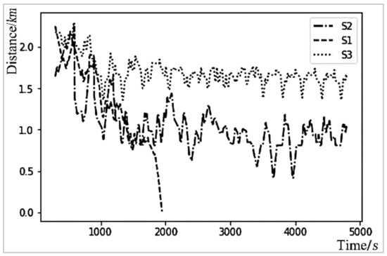 Finally, the shortest distance between buses under the three control strategies was compared. The simulation obtained Figure 8 (where the horizontal coordinate represents the bus running time and the vertical coordinate represents the distance between buses). In Figure 8, S1 represents strategy one, the single-point control based on timetable; S2 represents strategy two, the multi-point control based on time headway; and S3 represents strategy three, real-time control.