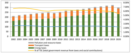 Dynamics of environmental tax revenues European Union-27 countries, billion euros. Adapted with permission from []. Copyright 2022, Eurostat.