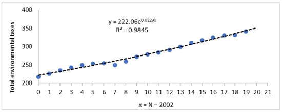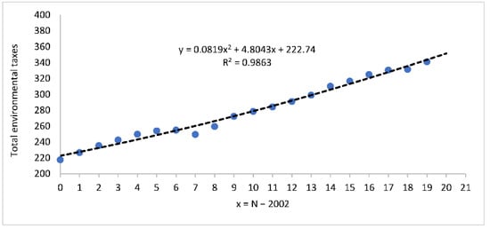 The forecast values of environmental tax revenues were calculated as follows (based on econometrics). The sequence of values of total environmental taxes (Table 1, variable y) is a time series with dependence on the year N (N = 2002, 2003, …). Let’s introduce the variable x = N − 2002, which takes the values x = 0, 1, … and examine the dependence of y on x. The study will be carried out using the method of least squares. The dynamics of the increase in tax revenues is shown in Figure 1.