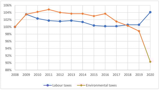 Labor and environmental taxes as a share of total taxation, EU 2008–2020, (index 2008–2020), % []. Reprinted with permission from []. Copyright 2022, Eurostat.