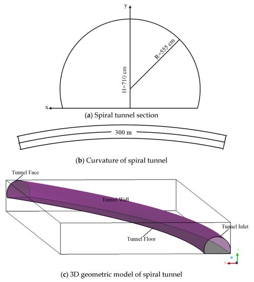 In this paper, the study background was based on a spiral tunnel in Honghe Prefecture (Yunnan Province, China) with a section radius of 5.55 m and a height of 7.1 m; the geometrical dimensions are shown in Figure 1a. The spiral tunnel has a radius of curvature of 720 m and a slope of 2.5%, and a 300 m long blind roadway; the plane diagram is shown in Figure 1b, and the three-dimension geometry model is shown in Figure 1c.