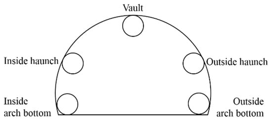 In linear tunnels, the left and right sides are completely symmetrical because of the linear type, so the hanging position of the ventilation duct is generally located at the vault, haunch, and arch bottom in a vertical direction. For spiral tunnels, the radius of curvature of the left and right sides differs by the tunnel’s width, then the hanging position of the ventilation duct in the spiral tunnel could be located at vertical and horizontal directions. Then, in this experiment, the hanging position (Factor A) listed five levels as vault, left haunch, right haunch, left arch bottom and right arch bottom (Figure 2). The distance between the ventilation duct and the tunnel face (Factor B) was between 5~25 m according to relevant regulations and construction experience, then the five levels of distance were listed as: 10 m, 15 m, 20 m, 25 m and 30 m. The ventilation velocity was decided by the need of ventilation volume of the 300-m long blind roadway. After calculating, the ventilation volume was between 1970~2930 m³/min, which meant the ventilation velocity of the duct (D = 1.5 m) was between 18.59~27.65 m/s, listed with gradient as: 18.59 m/s, 20.85 m/s, 23.12 m/s, 25.39 m/s and 27.65 m/s. The factors and levels of the orthogonal experiment are listed in Table 1.