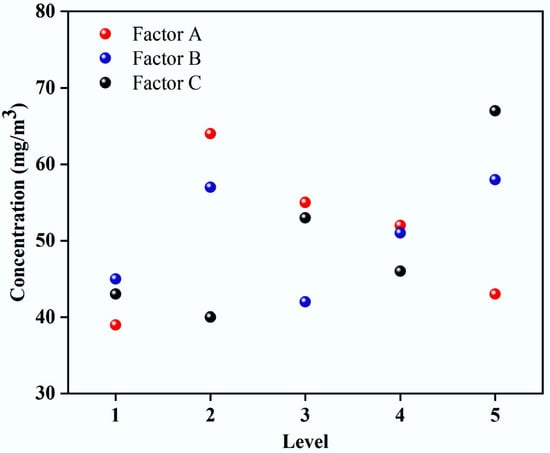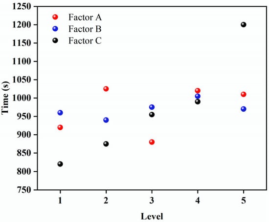 The range analysis result is graphically presented in Figure 6. The degree of effects of the factors was: Factor C > Factor A > Factor B.