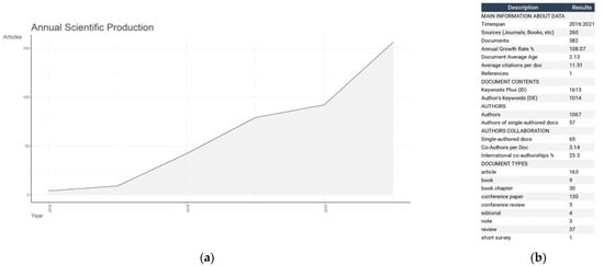 Bibliometric statistics of the publications on keywords of blockchain related to the land issues: (a) annual scientific production; (b) articles statistics.