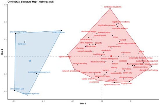 Figure 5 shows two elements (clusters), red and blue, which define the interconnection of individual keywords. The bibliometric method Metric Multidimensional Scaling (MDS) was used to define the conceptual structure of the terms used in the papers on blockchain related to land issues. Using k-means clustering, two elements are defined which include keywords that appear simultaneously in different papers. The results are interpreted based on the position of keywords; words that are more similar in distribution are shown closer to each other on the map. Thus, the blue cluster includes the keywords “land management”, “land use”, “smart contract”, “information system”, “information management” and “information use”. The above can be interpreted as mutually close concepts in the scientific literature that refer to land management procedures, defining the land management system, which is based on the information and data system. On the other hand, the red cluster is more diverse in terms of related keywords. Out of the general blockchain-related keywords, such as bitcoin, cryptography, authentication, internet, current, decentralized and commerce, a smaller number of blockchain-related ones that specifically refer to land systems are visible, such as e-government, land registries, registration systems and cadastre.