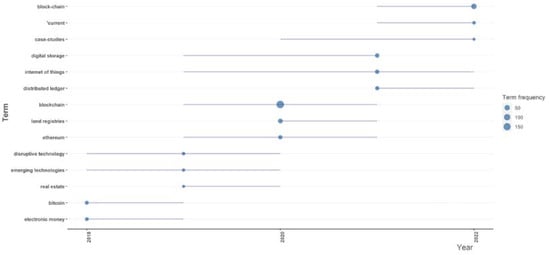 Figure 6 shows the evolution of the BC term related to the land issues over time. Until 2019, BC was associated with “bitcoin” and “electronic money” and similar terms, and from the year 2020, the term “land registries” entered the top 12 terms associated with blockchain.