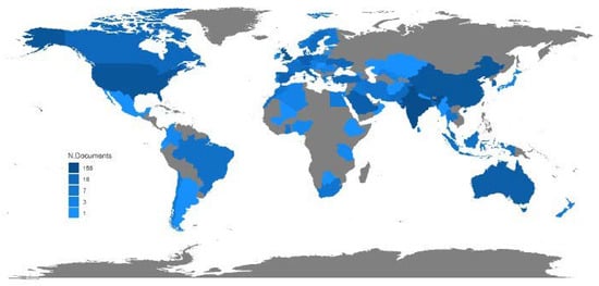 Figure 7 shows the scientific production of countries around the world. Colours were displayed based on the number of scientific papers published (in the Scopus database) per country. Productivity is defined by a colour scale, from dark blue, which refers to the most productive countries, to grey, which is the colour of countries where no scientific productivity has been recorded on the analysed topic. Countries with the highest productivity rates are India, the UK, the USA, Australia, China, Germany, the Netherlands, Italy, Spain, Canada, etc. On the map, Russia (27 papers published) and Vietnam (5 papers published) should also be coloured in blue, but due to the differently written names in the Scopus database and inside the Bibliometrix software, the software did not recognize them and so they are wrongly marked in grey. We could not change that inside the Bibliometrix software itself, so we were obliged to give an explanation on what happened. In Scopus, the names of the countries are Russian Federation and Viet Nam, but the Bibliometrix software recognizes the names Russia and Vietnam.
