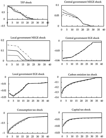 Figure 4 shows the impulse response of exogenous shocks and fiscal revenue decentralization on environmental pollution. It can be found that TFP shock and local government NEGE shock, the increase in fiscal revenue decentralization has further intensified the environmental pollution. With the increased fiscal revenue decentralization, the impact of the increase in central government NEGE on environmental pollution will be weakened. The effect of central government EGE shock, carbon emission tax, consumption tax, capital tax, labor tax, and nominal interest rate shock will further enhance the degree of environmental pollution with the increase in fiscal revenue decentralization.