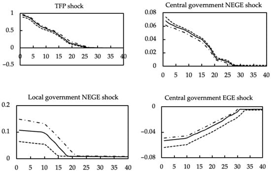 Figure 1 portrays the impulse response of exogenous shocks and fiscal expenditure decentralization on output. It can be found that the positive technology shock reduces marginal cost, and if the firms expand the scale of production, the output will increase immediately. Since the marginal return of capital is positively correlated with NEGE, the increase in NEGE leads to an increase in the households’ investment demand, resulting in an aggregate demand effect, which in turn increases output. It is worth noting that the positive externality of local government NEGE to output is larger than the positive externality of central government NEGE in the short run. The increase in government EGE has improved the production environment and living environment, thus stimulating total output growth in the short run.
