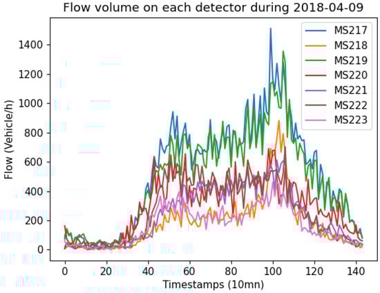 - Detector-wise: although the flow differs from one detector to another as shown in Figure 1, it may happen that patterns from different detectors have a partial similarity. Since these candidates are retrieved from different detectors, the other parts of them may be very different, which badly impacts the forecasting accuracy. Thus, if the prediction is to be made for a given detector, the model inspects only data related to it.