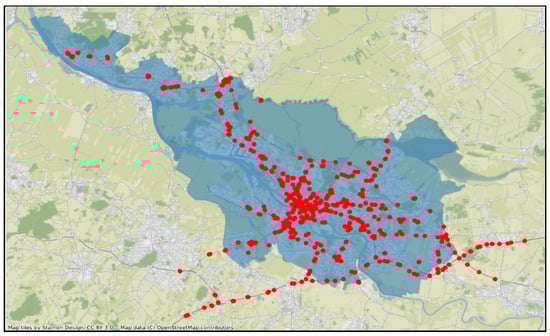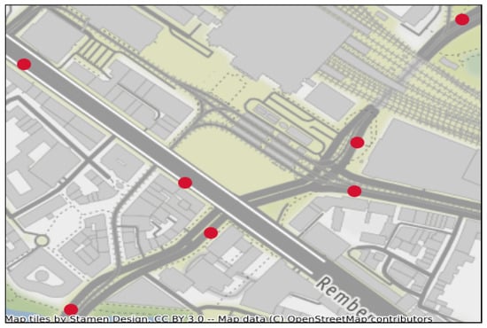 Figure 2 displays, in red bullets, the location of loop detectors installed all around Bremen to record traffic attributes. This paper is only concerned with one place of the city located in the city center. We focus on a junction surrounded by seven loop detectors (MS217–MS223), as shown in Figure 3. This junction is situated in front of the main train station as well as tram and bus stations, which makes the traffic in this area very messy and subject to a lot of factors. Traffic lights are highly present in this region, but unfortunately we have no data about them. As in any data gathering device, due to malfunctioning, repairing, or data transmission, many entries are missing in the final output recorded in databases. In our case, an important part of the data is missing over all 5 years. Sometimes values are missing for months, and further, the completeness level of many of the detectors is less than . For this reason we selected a time frame where the data to be used is almost complete (). First, we will use this data to train and test the predictive model. Afterward, we will destroy parts of this dataset and then try to reconstruct it with the different imputation techniques mentioned in the previous section. Detectors take measurements each 90s, however in our study we use 10 min accumulations. The precise dates used are from 9 April 2018 to 24 June 2018, which covers a period of 11 weeks. As we already mentioned, this period corresponds to the time frame having the least amount of missing entries. In order to measure the performance of the imputation techniques and the accuracy of the forecasts delivered by the predictive model, we divide our dataset into two parts. The first one consists of 8 weeks used for training, followed by 3 weeks for testing. Precisely, training takes place from 9 April 2018 to 3 June 2018 then we test for the period going from 4 June 2018 to 24 June 2018. The best imputation strategy will be later used to fill in missing, corrupted, and outlier values in our database.