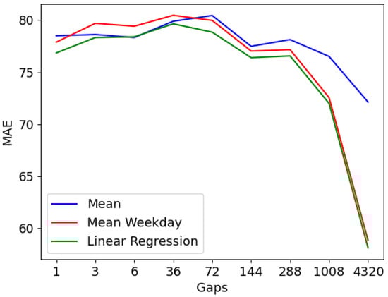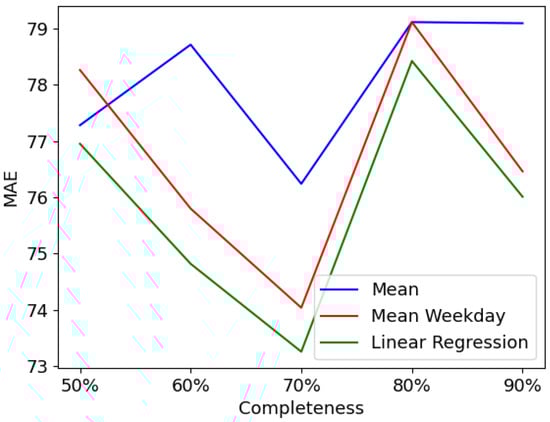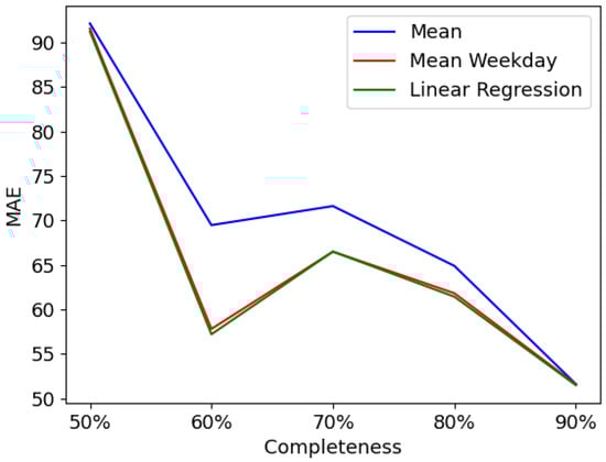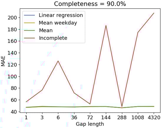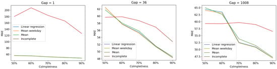 In order to measure the performance of the imputation methods, we consider the same split mentioned above for our dataset. The first one is used to train the methods, and the second part is to test their performance. We use mean absolute error (MAE), given in Equation (12) as a criterion of accuracy. From the results reported in Table 1, Table 2 and Table 3 and their corresponding Figure 4, Figure 5 and Figure 6, we clearly see that the three methods are closely competitive; however, it is obvious that the linear regression model is more accurate than the others. The performance of the three models varies in function of completeness level and gap lengths as well. Therefore, in what follows we comment and discuss the results based on these attributes.