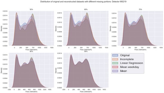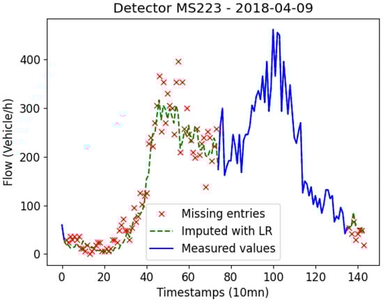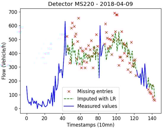 In the literature, researchers generally consider datasets with a few missing entries that are usually imputed using simple techniques, otherwise, they take into account only valid data. However, only a few of them drew attention to the impact of data loss on the performance of predictive models. Therefore, some techniques have been used in the literature to substitute corrupted and missing entries with valid data. First attempts were made, for instance, by Nihan et al. [] by deploying the classical auto-regressive integrated moving average model. Zhong et al. [] proposed different techniques to substitute missing input, including neural networks and regression models. Later on, a non-parametric spatio-temporal kernel regression model is developed to forecast travel time under the assumption of sensor malfunction. The results were compared to a k-nearest neighbors model, which is also non-parametric. The k-nearest neighbors technique has also been used for traffic data imputation in []. Tian et al. proposed a long short-term memory-based neural network that efficiently circumvents the negative impact of data loss []. Duan et al. [] employed a deep learning-based approach called denoising stacked autoencoders for efficient imputation of missing data. Teresa Pamula [] investigated the sensitivity of neural networks to loss of data in traffic flow prediction and proposed a strategy to substitute lost data in a way where the accuracy of forecasts is maintained. Some statistical models, including Markov chains, PPCA-based approaches, and Monte Carlo simulations have also been used [,,,]. An automated imputation procedure based on an adaptive identification technique that tries to minimize the error between simulated and measured densities was elaborated by Muralidharan and Horowitz []. Other techniques such as replacement by null values, substituting by the sample mean, or exponentially moving average were considered for testing and they showed good performance practically [,]. Several other strategies have as well been used including fuzzy C-means hybridized with a genetic algorithm [], tensor-based methods [], and simulator software such as Sumo and TransWorld [].