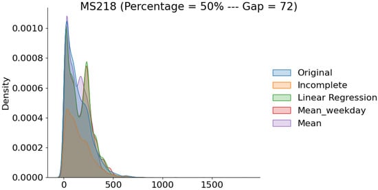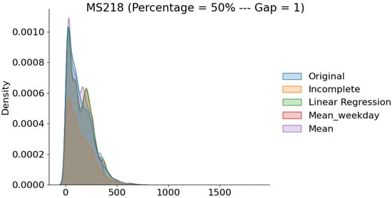 The plots in Figure 7 are taken from detector MS219 and aggregated by the percentage of completeness. We can clearly see that as we increase the percentage of incompleteness, the deviation between original and reconstructed datasets tends to grow, and vice versa. Although the filling methods are closely competitive, we can notice that linear regression has the least deviation from the original data, accordingly to what has been reported above. Similar conclusions can be drawn as we increase the gap length as well, as shown in Figure 8 and Figure 9 taken from detector MS218. Note that this is also the case for almost all the other detectors.