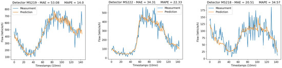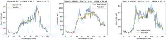 Predictions of traffic flow on randomly chosen detectors (working days).