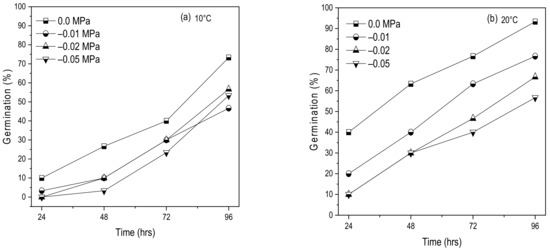 The G% decreased with a decrease in ψ from 0 to −0.01, −0.02, and −0.05 MPa compared with distilled water (0 MPa) by 93.3%, 76.7%, 46.7%, and 56.7%, respectively, i.e., the average for all levels of AAP. Similar findings were reported by previous studies that reported a longer accelerated aging period and lower ψ (more negative) decreased both G% and GR in various crops [8,9,12,37].