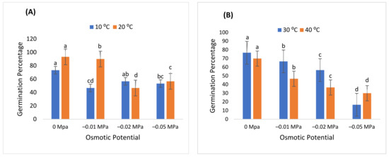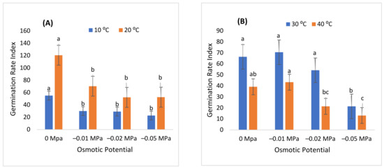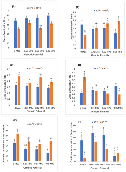 In addition, the highest mean germination time was recorded at 10 °C induced with −0.05 MPa, while the lowest at 30 °C induced with distilled water (Figure 2). Similarly, the MGR was determined as the reciprocal of MGT, and the CVG was noticed to be highest at 30 °C induced with distilled water (0 MPa). The highest CVt was observed at 30 °C at −0.01 and the minimum at 40 °C induced with distilled water. Moreover, Figure 4 illustrates that the highest and lowest GE, GRI, and TGI were observed at 20 °C in −0.01 MPa and 40 °C in −0.05 MPa, indicating that increasing T and ψ there would be a significant reduction in the growth phases of the germinating seed.