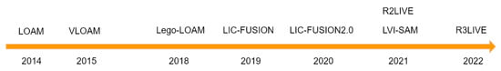 SLAM (simultaneous localization and mapping) aims to solve the problem of locating and mapping a robot in an unknown environment. Multi-sensor information fusion technology endows the system with high robustness and accuracy and has become the main research direction in this field. In general, fusion methods are classified into three types, comprising EKF-based, factor graph optimization-based, and factor graph optimization plus EKF-based multi-sensor information fusion methods. Most mainstream SLAM open-source algorithm frameworks that are based on multi-sensor information fusion employ laser or visual sensor fusion strategies. Figure 1 illustrates the technological progress of the frameworks.