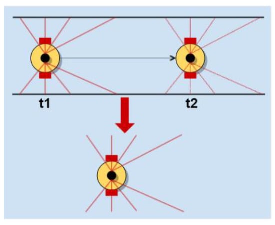 An example of this is that when a robot passes through a long, straight pipe (Figure 3), t1 and t2 are used to represent the radar measurements of the robot at two different moments in the environment that show high similarity, respectively. It is suggested that despite the two different moments, there is little difference in the number of radar measurements, which is most likely to cause the unavailability of the radar data. From the point of view of the robot, it cannot pinpoint its position within this environment. Moreover, the direction of the pipe is not restricted, due to the similar height structure throughout the pipe, meaning that the robot cannot achieve self-localization. Likewise, it is difficult for vision sensors to obtain useful feature points or reference points in scenes that are highly similar, such that relying on vision sensors may also cause localization failure.