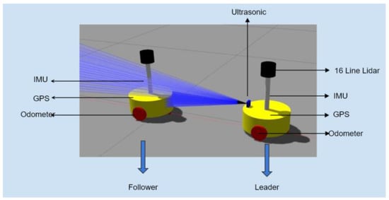 The proposed SLAM method was validated experimentally through computer simulation in this study, based on the constraints of the real environment of the pipeline. The experimental environments were implemented using ubuntu 20.04 and the ROS system (noetic). Two simulated Leader and Follower robots were generated, respectively, under two namespaces and using two-wheeled differential drive robots with a structure as presented in Figure 4. It was modeled as a cylindrical body, with a diameter of 150 mm, a height of 70 mm, a diameter of the robot tire of 70 mm, and a width of 30 mm. In addition, the Leader, versus the Follower, released ultrasound topics and LiDAR topics for fusion and map construction, as well as sensor data registration under Gazebo simulation conditions. Four aspects were devised in the experiment as follows. SLAM testing in a common environment. To verify the applicability of the method in this study to the common environment, we incorporate the following variables:
