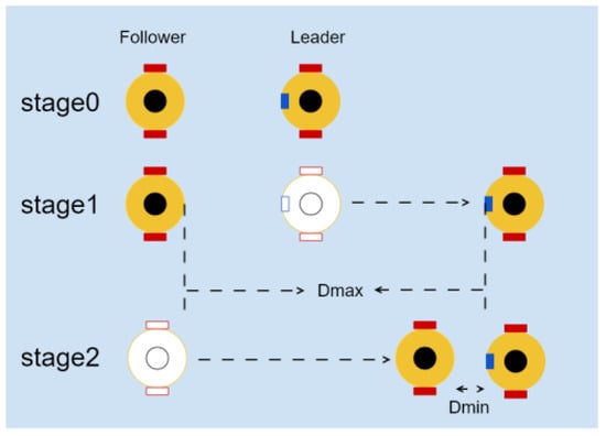 - Stage 2 is the contraction stage. At this stage, the role of the Leader is converted to a reference, while the role of the Follower is transformed into a mover. The Leader is stationary, and the Follower’s movement is transformed into the movement direction of the Leader at the minimum contraction distance, .