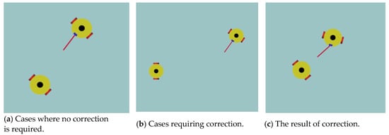 To solve the above problem, a tripod head should be installed for the Leader’s ultrasonic sensor, and the rotation of the tripod head should be controlled by solving the deflection angle of the Follower in an ultrasonic tripod-head coordinate system. Thus, the detection direction of the ultrasonic sensor always points to the center point of the Follower, to ensure the reliability of ultrasonic observation. The ultrasonic detection direction correction is illustrated in Figure 6. The Leader and the Follower move in the same direction in Figure 6a, and it is not necessary to correct the ultrasonic sensing direction. When the Leader changes its direction in Figure 6b, we expect the ultrasonic Leader sensor to always point to the Follower’s center, and the ultrasonic sensing direction should be corrected. The ultrasonic sensing direction is corrected in Figure 6c to point to the Follower center.