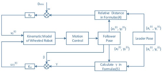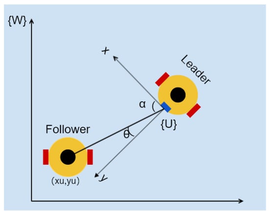 In Figure 8,  represents the angle of the line between the Follower and the Leader with the horizontal coordinate of the world coordinate system ;  represents the angle of the front direction of the Follower, with the horizontal coordinate that of the world coordinate system . The Follower’s angular velocity  at time t is expressed by Equation (5):