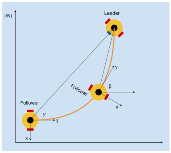 The position relationship of the Follower with regard to the Leader coordinate system  is assumed, as presented in Figure 7.  in the figure is expressed by Equation (2):