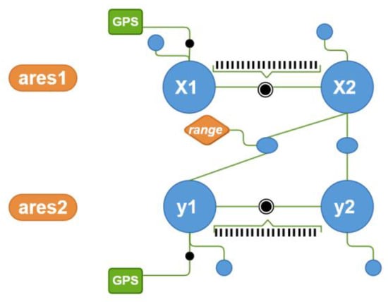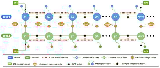 The factor graph of the system comprises two factor graphs (including ares1 and ares2), representing the factor graphs of the two robots, i.e., the Leader (blue) and the Follower (green), respectively (Figure 10).