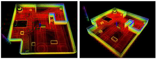 Only the proposed method in this study was verified since the applicability of the LIO-SAM algorithm, FAST-LIO2.0 algorithm, and Odom IMU fusion method were verified in common environments. In the following scenario, the two robots were trained in a queue, as expressed in the previous section, and environmental data were collected in the room according to a creeping collaborative periodic strategy. The fusion effect in real situations was simulated by adding some Gaussian noise to the Leader and Follower’s sensors, respectively, and the wheel slip of the robot was simulated at corners and walls.