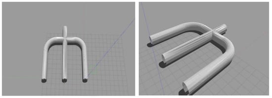 A pipe with two long straight bends, four-way bends, and 90-degree bends was used to represent a common pipe environment containing a variety of typical pipe configurations. This model was trained using SolidWorks and then converted to a URDF model and imported to the Gazebo simulation environment for testing. The pipe model is illustrated in Figure 15. In the SLAM test, Gaussian noise was added to the robot sensors, and wheel slip was simulated at the pipe turns.